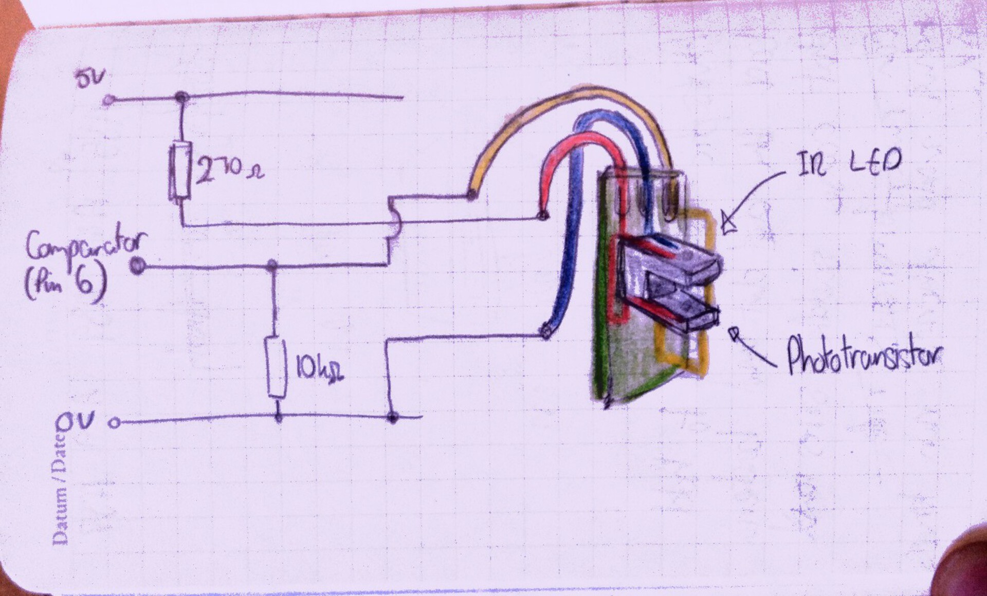 <figcaption id="caption-attachment-139" class="wp-caption-text">The pin arrangement for the horseshoe IR block sensor. Using the circuit shown, it was not a clean digital signal (rather 0/1V). After setting up a comparator interrupt using a potential divider at 1V (which did work), I realised I was being stupid and tied the 270ohm resistor to ground instead, given the photodiode a full 5V to work from and allowing me to use the simple digital interrupt.</figcaption></figure>