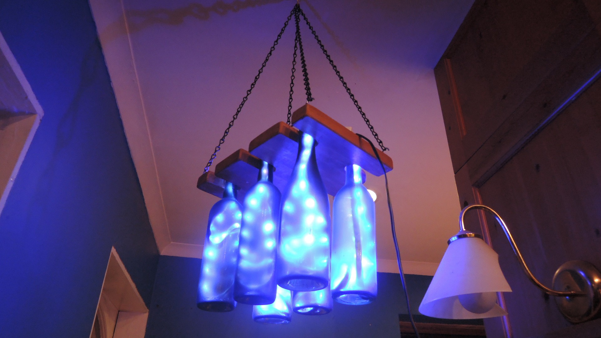 My sister wanted a wine bottle light, like she spotted on the internet somewhere. It’s not really a chandelier, I gave it my own twist. The bottles have been sprayed with frosting, and are lit with 5050 LED RGB strip; allowing for any colour light.
