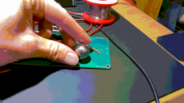 Sandwiching a flat magnet between the ball track and PCB was something I tested. Here a small magnet is shown to move with a steel ball magnetically attached - the case would sit between the two.